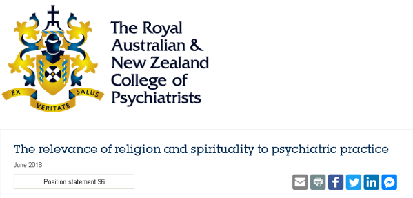 ”The RANZCP recommends that psychiatrists: ensure the provision of holistic assessment and care taking account of a person’s ‘body, mind and soul’, encompassing their physical, psychological, sociocultural and religious/spiritual needs and values.”